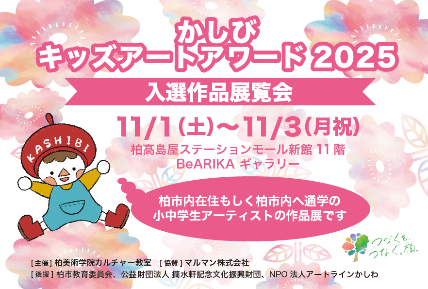 かしび キッズアートアワードは「小中学生の子どもたちのアートや絵画への関心と関わりを高め、創造すること・表現することの楽しさを知ってもらいたい!」という思いを込め、柏市の文化芸術の振興を目的に実施する絵画コンクールです。アートラインの期間に絵画コンクールの入選作品展を開催いたします。柏市内の子どもたちの力作をぜひ見にいらしてください。